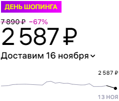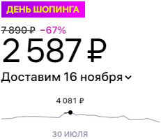 0 butterpillar 1 год назад Почти научились не врать Цена до акции: 3181 Во время акции: 2587 Пиковая цена за все время: 7890 4081! Реальная скидка во время акции - чуть менее 20%, а не 67%. Конечно, уже лучше, чем на некоторых других маркетплейсах, где цена во время акции выше, чем до, но еще есть куда стремиться :) Показать полностью 2 Wildberries Акции Обман Маркетплейс 1 Ещё 0