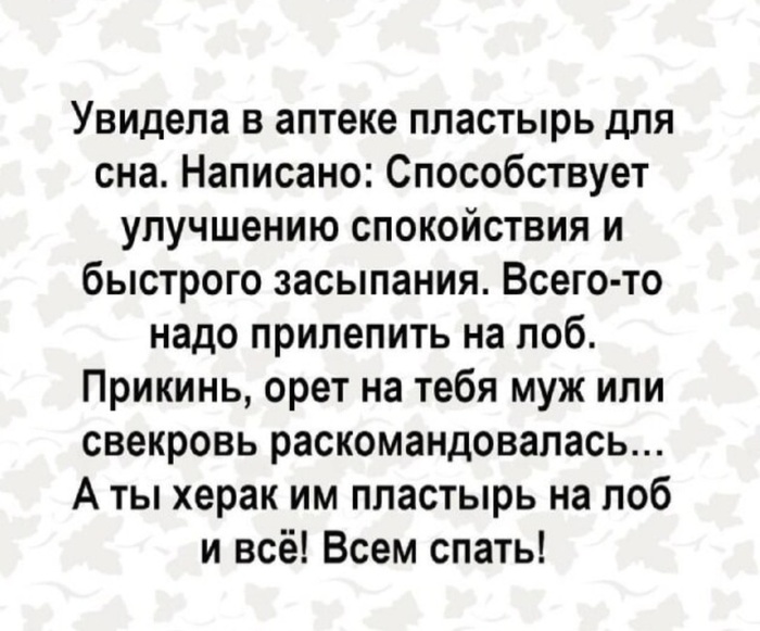 3 byakachka 1 год назад Всем спать или тишину в студию! Не помогло, есть ещё способ из могучих пластырей (кто бы знал что они так многогранны в помощи), так же подходит для семейных пар, которые любят попиздеть перед сном и из за этого не высыпаются ))) только оцените идиллию на рекламной фото 😅 Показать полностью 2 Тишина Пластырь Ещё 0