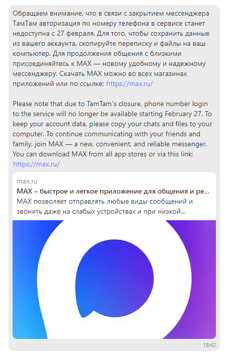 27 февраля 2026-го года сервис будет закрыт. Что было сообщено сервисным уведомлением в самом мессенджере, рассылаемым пользователям с первой половины февраля. В этом же сообщении предлагается перейти на мессенджер MAX, что логично ибо обе "говорилки" - это детища компании VK Лично я ТамТамом пользовался мало, но регулярно. Могу сказать, что года с 20-го он вообще никак не менялся. Сразу по появлении ТамТам был неплохой и довольно стабильной копией телеги, глючил он гораздо меньше того же Макса. Тем не менее канал в Максе я уже создал. Да и тележный канал еще не забросил. Ну а по ТамТаму даже немного поскучаю, потому что это был уютный, ламповый сервис - симпатичный и хорошо оптимизированный и работающий.
