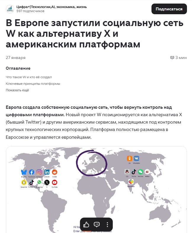 Друзья, что думаете? Пишите коменты! Лично я думаю, отбросив эмоции, личное отношение, смерть от кринжа и прочее неудобство, что рано или поздно (лет через 5-10), мы все придем к локальным интернет-сервисам. В России будут только Макс и ВК-видео В Китае будут только Вичат и Baidu В Америке будут только Snapchat и YouTube В Европе будут только W и Dailymotion У всех остальных - будет что-то из вышеперечисленного. И никак иначе, никакой свободы выборы для простых пользователей. Все крупные политические игроки (Россия, Китай, США, Европа) стремятся к цифровому суверенитету и контролю информационного пространства (привет американскому тик-току и китайскому файерволу). Ну и пользуюсь случаем, скину ссылку на свой канал в MAX! Подписывайтесь! Там есть коменты и полная свободы слова, как и на всех остальных моих страничках впрочем.