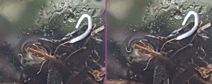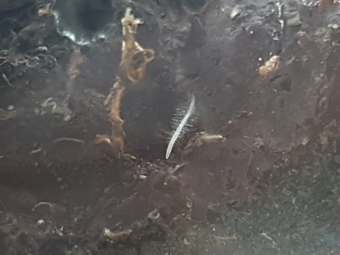 Это "нечто", назовем его - "Георгий", чем-то питается и появляется ближе к вечеру, возле стенок аквариума. С помощью камеры телефона видно, что Георгий, кушает мелкие частицы и они проходят по его "кишечнику".. Немного жутковато.. Жаль, что на фото, этого заметить не возможно, но все же вот вам крупный план:
