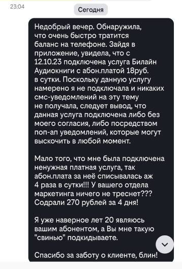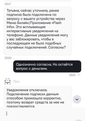 В общем, по словам оператора, всё норм и маман сама виновата, а Билайн весь в чистом и белом. Денег не вернём, но вы держитесь и хорошего настроения вам.