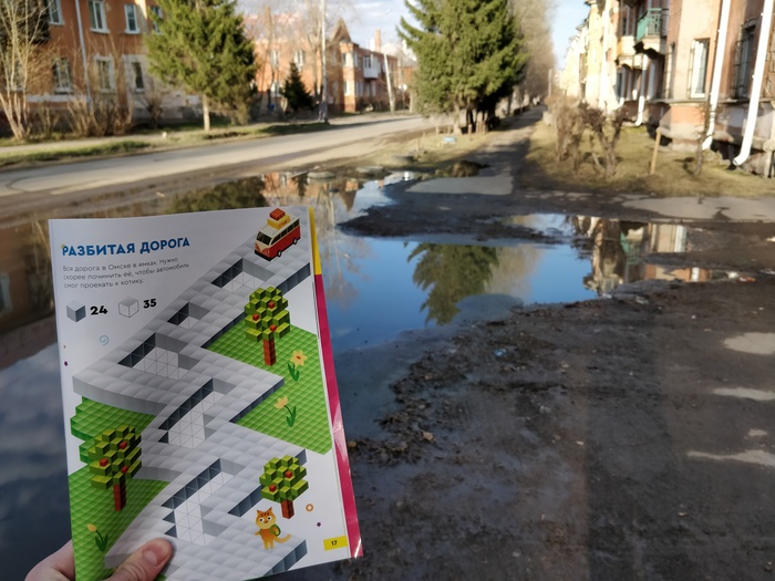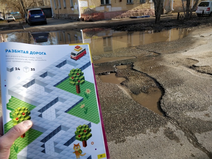 Вечером ходили в гости, взял тетрадь с собой, показал друзьям. От души посмеялись (сквозь слёзы, конечно - потому что правда). Дело в том, что в Омске пару лет назад отремонтировали основные дороги. А вот НЕосновные - НЕотремонтировали. Жалобы пишу - не помогает. По пути в гости сделал пару фотографий с тетрадью на родной улице Малунцева: