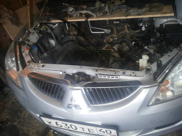 15 августа, раннее уторо, один из самых долгожданных дней в этом году для меня настал и я со своим отцом отправились в путь. Предстояло нам ехать 90км. Долил масла, выехали. Проехав около 20-ти км, двигатель начал троить и на холостых оборотах появилась дрожь, при этом, ощутимо упала и без того уставшая, мощность двигателя. Начал паниковать, позвонил Сергею, но он меня успокоил, сказал, что вызовет эвакуатор и все равно все сегодня сделает. Пришлось снизить скорость и на трех цилиндрах мы добрались к месту назначения. Приехали к Сергею, опоздав на пол часа 6:30. Познакомились, Сергей вкратце рассказал что и как собирается делать и со своим напарником взялись за работу. Ребята с первых минут дали понять, что свое дело они знают: каждая операция доведена до совершенства. Один ковыряется в яме, второй под капотом. Достали двигатель подъемником, поехали дальше. Открутили массу непонятных для меня гаек, болтов, сняли все агрегаты, датчики и настал момент истины: снятие головки. Свернули ребята бошку моему лансеру и вот, что мы там увидели: