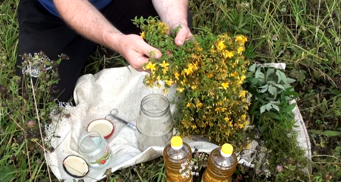 Масло из зверобоя делают по-разному, кто-то из одних цветочков, кто-то из всего растения без корня. Я сделал второй вариант.