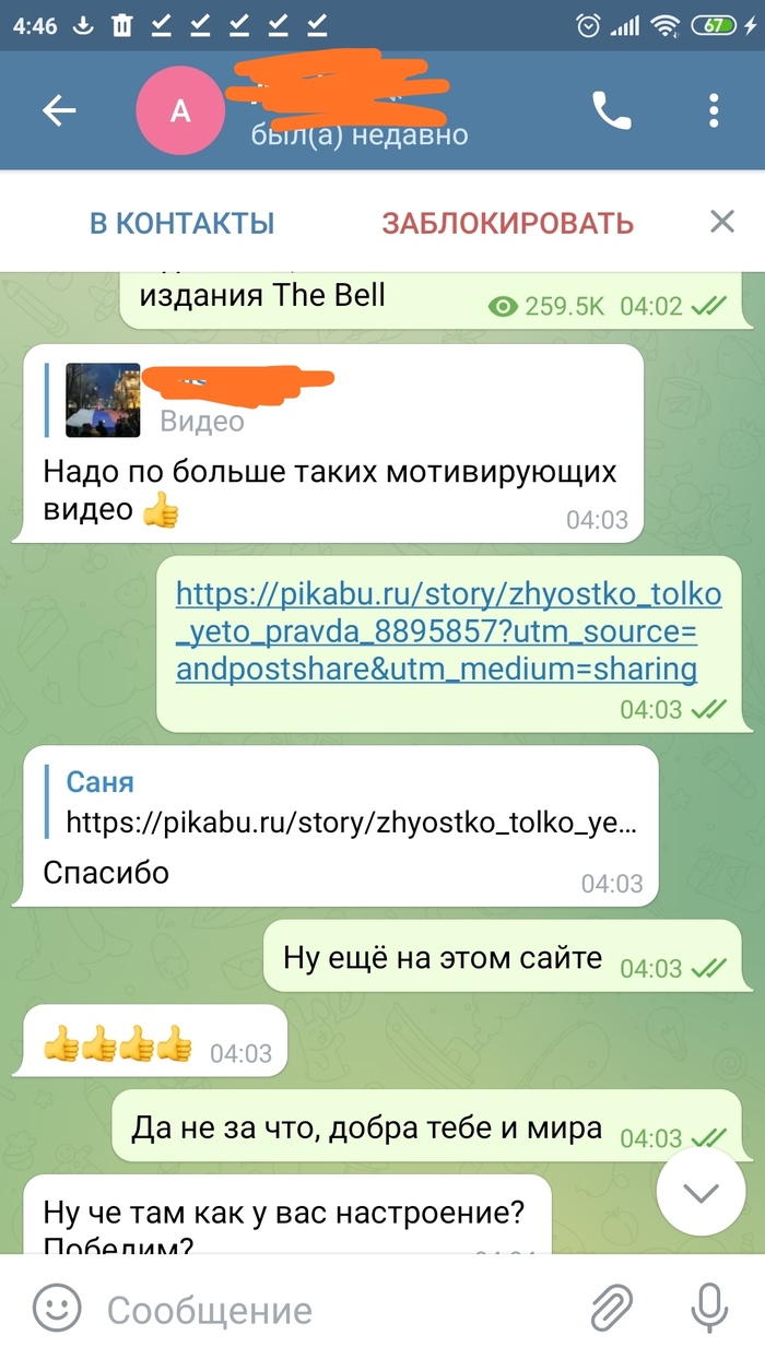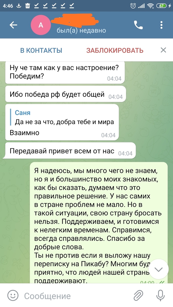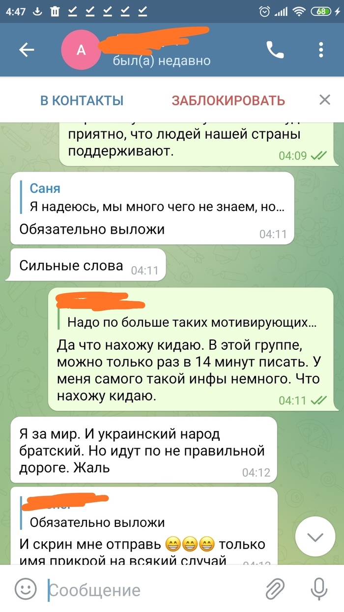 В связи с последними событиями, очень часто сижу в телеграмме. В одном из проукраинских каналов, в комментариях оставляю информацию, которую им не покажут. И вчера в личку мне написал один человек. Было приятно знать что нас поддерживают. Простите за много букв и сумбур.
