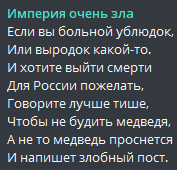 "Мне похуй, кто там за кого. Я одинаково ненавижу всех пиздоглазых. Надеюсь их трупы доедят собаки" Д. А. Медведев