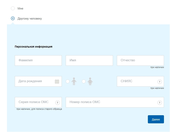 Для примера выбрал "другого". Нужны паспорт-полис-СНИЛС.