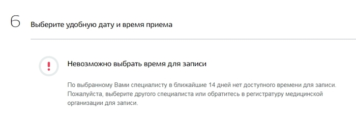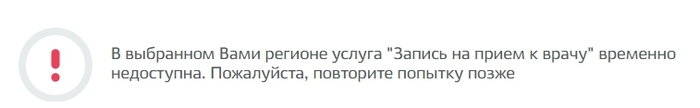 Мне даже несколько раз вылезало сообщение вроде "В Вашем регионе нет записи к врачу" (скрин не сообразил сделать, прошу прощения), но я боролся и искал, нашёл и не сдавался и продолжил тыкать.Как понимаю, это сообщения ставят также для случая "нет ответа от информационной системы региона".