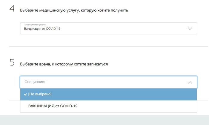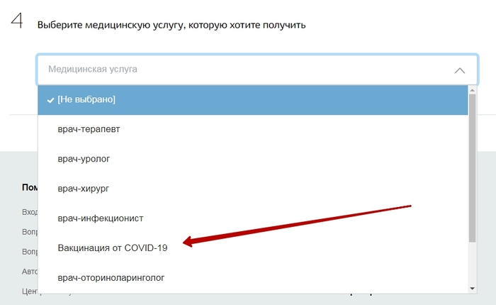 Тут опять возможна ошибка "В Вашем регионе нет записи к врачу", не переживаем - выбираем любую другую мед. услугу, и потом опять "Вакцинация от COVID-19" (чтобы обновить данные на странице).