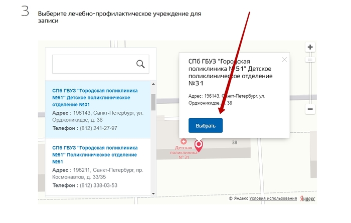 Шаг 5: жмакнуть "Выбрать" на поликлинике на карте