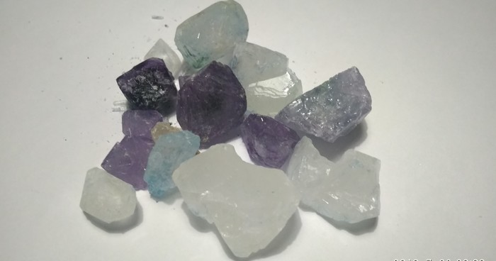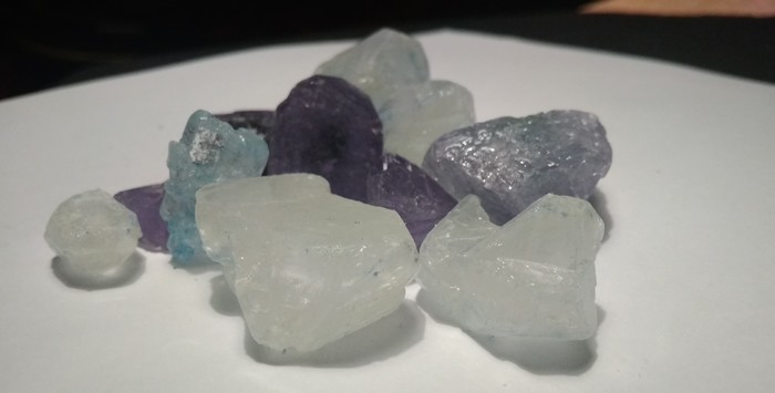Выбираем из этого всего самого достойного кандидата. Они синеватого цвета через грязи которая не отфильтровалась, и теперь села в осадок, но сами кристаллы сами по себе, после 3 секундной промывки водой, довольно прозрачны.