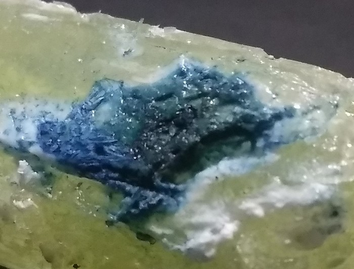 Почему на нем видно пятно синего цвета - неизвестно. Вероятно это плесень(растворы некоторых солей при длительном стоянии могут зарастать), или след от сульфата хрома-калия, с которым он хранился.