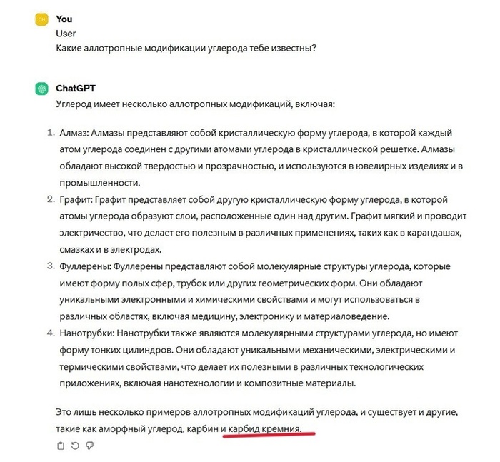 В целом, ответ меня устроил, кроме последних двух слов. Карбид кремния – это не аллотропная модификация углерода, а отдельное соединение, причем сложное вещество, а не простое, поскольку состоит из разных атомов (углерода и кремния).