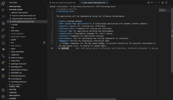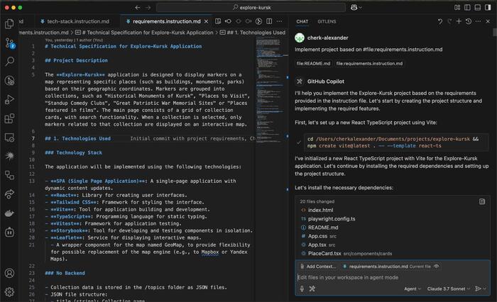 3️⃣ На выходных решил набросать MVP пет-проекта из бэклога. Сначала написал ТЗ с помощью ИИ, положил его в .github/instructions/requirements-instruction.md и попросил Copilot написать проект по ТЗ. Он справился, потребовались лишь небольшие правки. Теперь при любых изменениях он уже знает требования.