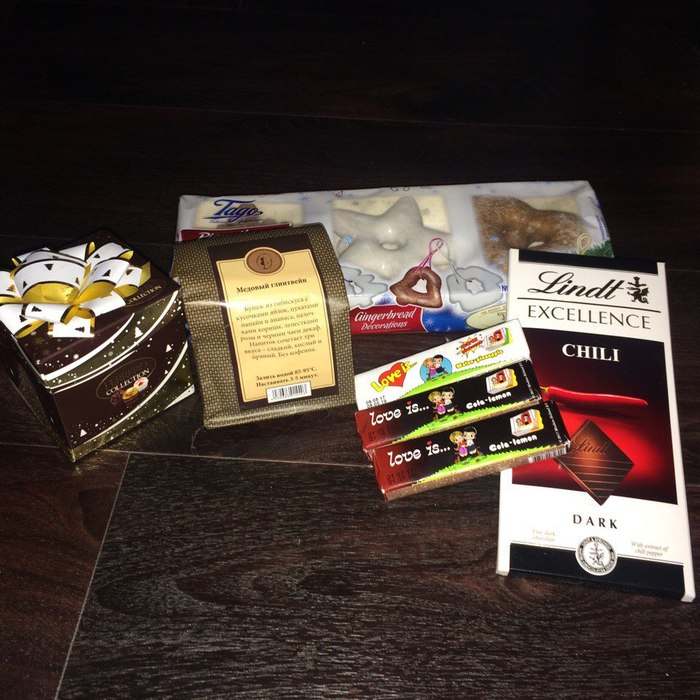 Начнем со сладенького, подарочный набор от Fererro roshe, шоколадка с чили(уже покупал как то такую, очень интересное послевкусие благодаря перцу), медовый набор для глинтвейна, новогодние пряники с корицей и жвачки "Love is...".