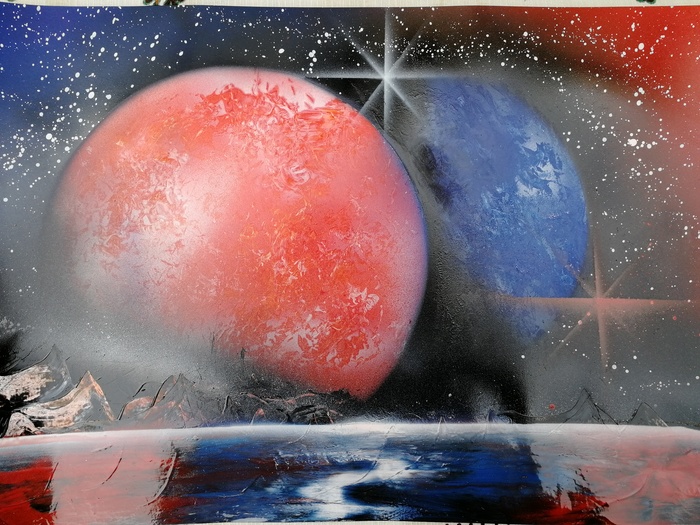 Используемые материалы: спрей краска, глянцевая бумага, подручные материалы (тарелки, шпатель, агитка по конституции), воображение.