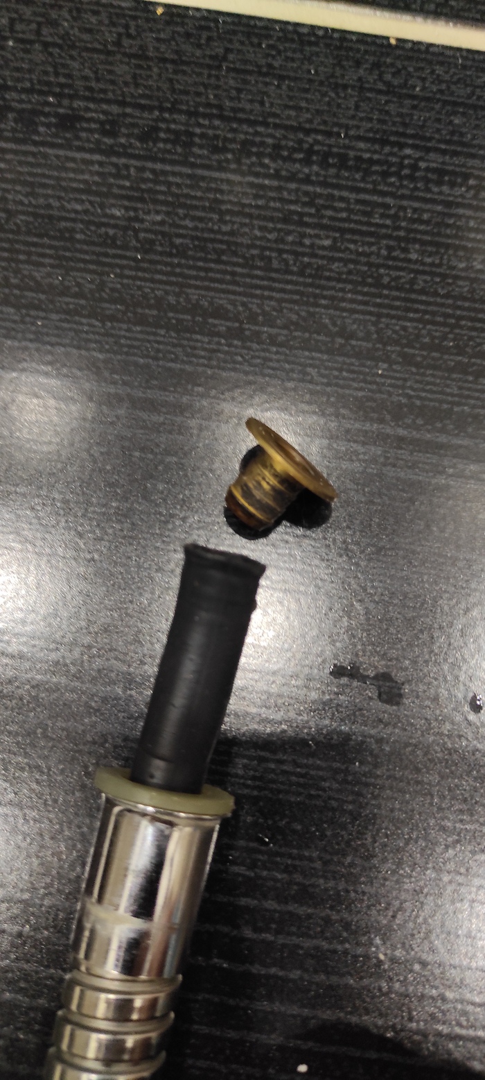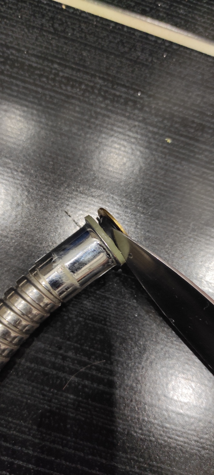 Уже дома, демонтируется шланг лейки, снимаются ножом два металлических грибка с обеих сторон, срезаем старый резиновый шланг.