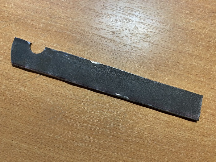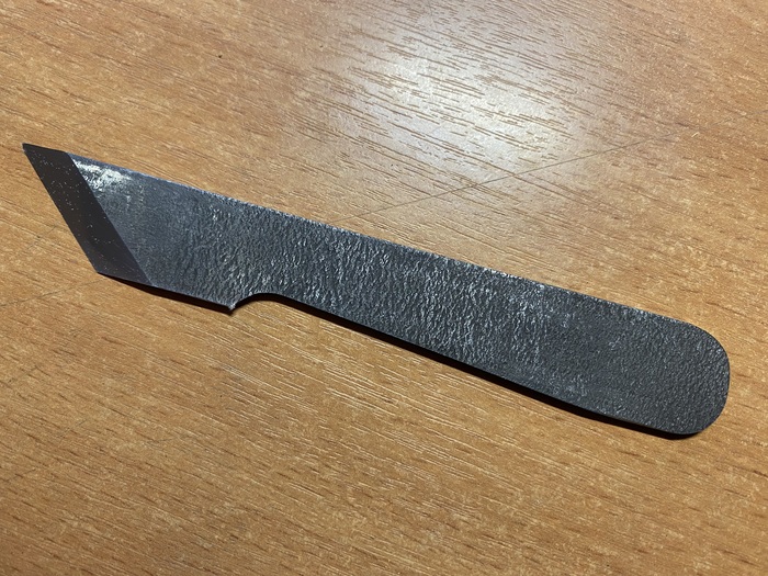 Думал какой бы ножик из нее сделать и вспомнил что для работы с кожей хотел раздобыть пару косячков (не тех что курят, а тех коими режут) с односторонней заточкой под разные руки, поскольку в зависимости от ситуации резать удобнее то левой, то правой рукой. В длину обломок был 12 см, поэтому было решено после отпиливания при помощи болгарки зубьев распилить полотно пополам вдоль. В итоге получились две заготовки каждая шириной по 17 мм.