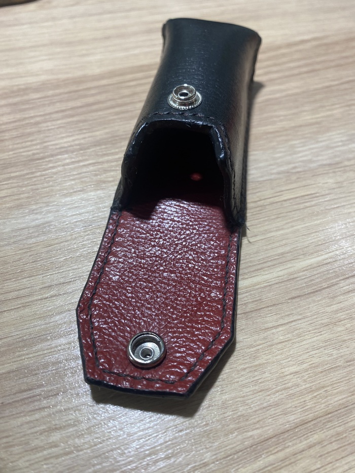 Коллега попросил сделать чехол для подаренного женой мультитула. Поскольку изделие не большое покупать ничего не пришлось. Достаточно было порыться в обрезках от предыдущих экспериментов. В итоге на лицевую сторону нашелся обрезок полы толщины и плотности достаточной для придания необходимой жесткости изделию. Внутреннюю сторону было решено для контраста сделать красной. Перед сшиванием обработал обе стороны финишным кремом для блеска, установил кнопку. Урез обработал краской для уреза. Вот такой чехол получился в итоге. Фото процесса к сожалению не делал.