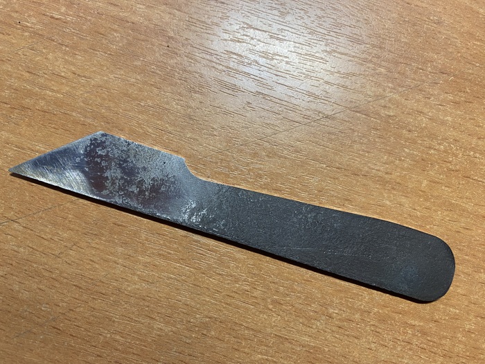 Прикинул на бумаге контуры, так чтобы гармонично смотрелось и угол скоса клинка позволял удобно работать. Далее опять в ход пошла болгарка. После придания общего контура на наждачном круге подравнял края и свел лезвие на одну сторону.