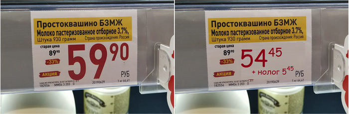 Я показать вам другую сторону этого дна. Во всех ценах заложены налоги, про которые мы, покупатели, не думаем в момент. Я точно знаю, что какая-то часть стоимости купленных мною продуктов уйдёт в казну прямо из магазина. Но какая именно, увы, не разбирался. Беглым поиском на пикабе не нашёл, а в интернете пишут, что на некоторые продукты НДС = 10%, а на остальные = 20%. Теперь предствьте у нас такие вот ценники: