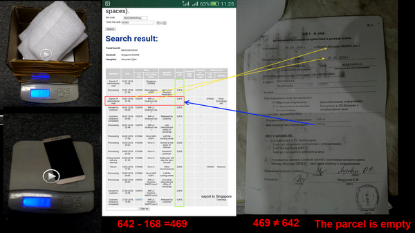 Было понятно одно - защищаться теперь придется мне. Решение было найдено быстро - это вес из видео Продавца, а именно, что посылка с телефон весит 637гр, а сама посылка на территории России уже трекалась с весом 476гр. Я ему послал следующий коллаж: