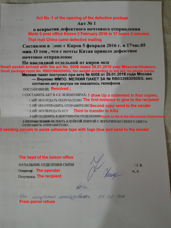 Понять их можно(Китайцев) на бумажке, на непонятном языке, что-то там написано, и как то там переведено, верить ли этому? Нет! Давайте будем указывать на сайт отслеживания и говорить следующее: "on January 29 the package is still in processing centers. , February 4 get to the post office The russian post office document issues on January 29 (proved to be empty packet) --- packages did not arrive to post office ,how to know empty ? --- This evidence obviously is not acceptable Since the ACT documents provided by post office . so the package should reach the local post office first , then know empty or not pls read carefully"