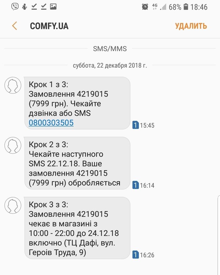 Маразм крепчал и при очередной попытке заказать акционную консоль, у меня принимают 22.12 заказ, приходит смс в три этапа: заказа принят, заказ обработан и заказа готов к отгрузке.