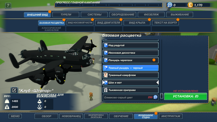 Мы можем его разукрасить, усилить его броню, поставить мощнее двигатели, чтоб еще больше навешать брони, поставить более мощные турели, выбрать полную экипировку самолета (сколько аптечек, огнетушителей, парашютов).Можно взять даже почтового голубя))