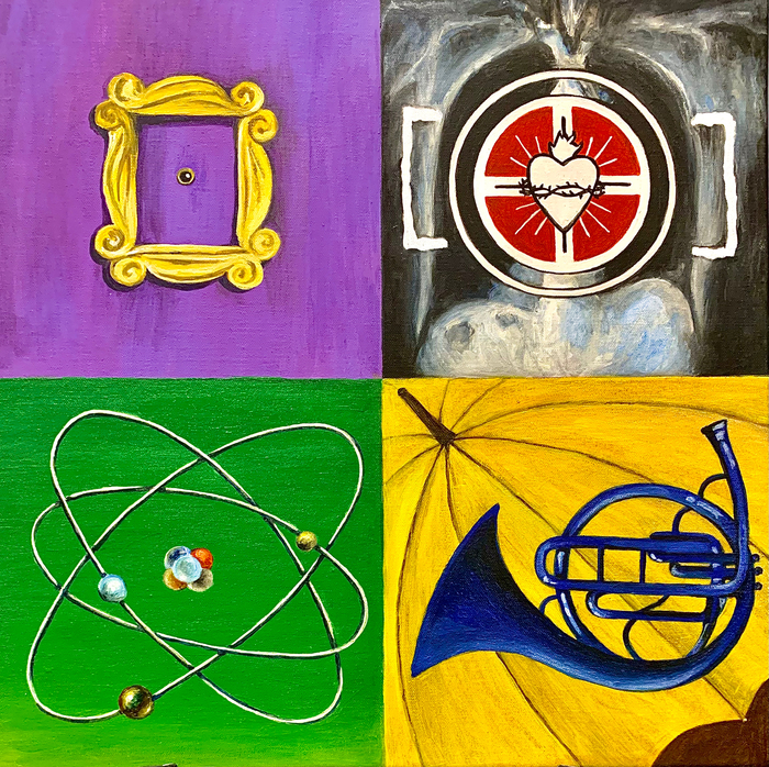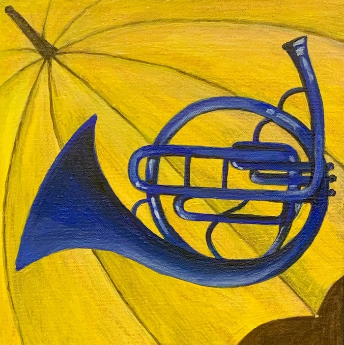 Так, ну и завершила я свой рисунок сериалом «Как я встретил вашу маму». Если где-то найти символ было тяжело, то здесь их было целых два. Два равнозначных символа. Что же выбрать? Нужно просто нарисовать оба, решила я. Так на фоне жёлтого зонта отлично пристроилась синяя валторна.
