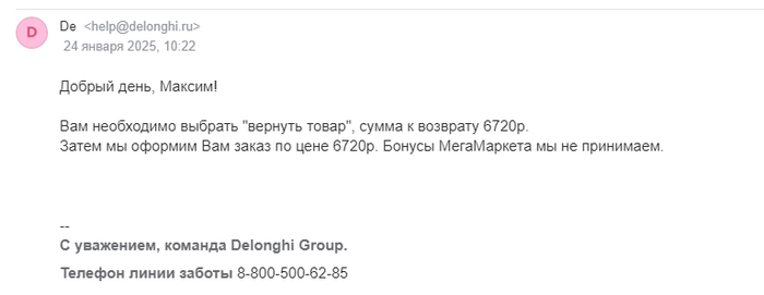 Утрясаем формальности: Прислали курьера (за свой счет) за оригиналом акта. Оформил возврат денежных средств и через 2 дня деньги поступили на карту. Оформил новый заказ и оплатил 6720 р. Встретил курьера в удобное для меня время: