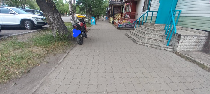 Заглушим двигатель и откатим мотоцикл дальше. Теперь то стало лучше, и мы никому не мешаем, но постойте ка, здесь нельзя ставить ТС на тротуаре. Это уже 12.19 КоАП РФ, и штраф за такое предусмотренмв размере 1000 рублей, а в некоторых городах выше. Закрадывается вопрос - а чем в данном случае мотоцикл отличается от велосипеда, который таким способом припарковать можно?