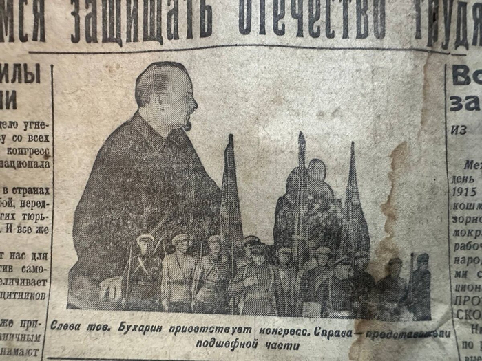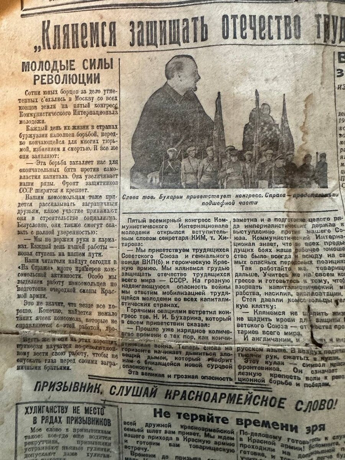 Вся первая страница посвящена призыву и на ней гордо красуется тогда еще товарищ Бухарин: