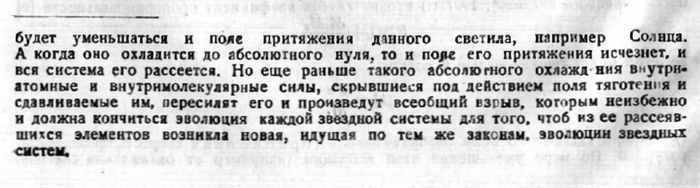 Научная мысль уже рисует нам, что всякая звезда зарождается из туманного скопления, проходит определенные стадии развития, отделяя от себя ряд планет, и, наконец, как дерево, которое, возникнув, главным образом, из воды и газов воздуха и достигнув предельного возраста, прогнивает внутри и рушится, обращаясь снова в воду и газы воздуха с ничтожной примесью почвенных веществ,— так и звезда, охладившаяся, повидимому, до абсолютного нуля температуры, освобождает скопившиеся в ней внутриатомные и внутримолекулярные силы, которые со взрывом снова обращают её и все её планеты в спиральную туманность, со вспышкой, производящей впечатление временной звезды *.