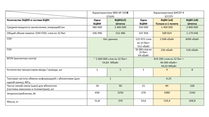 Данные для Бурана приведены как для четырех БЦВМ (В первом полете четыре отсутствовали из за малого количества полетных задач), так и для восьми (планировалось, как штатное количество)