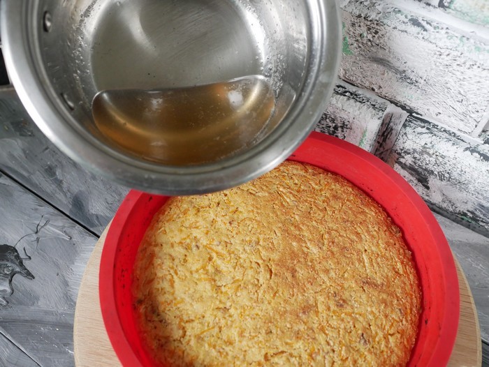 Перекладываем его сразу же на блюдо и пока он ещё горячий поливаем его сиропом. Чтобы кекс хорошо пропитался сделайте в нём деревянной шпажкой или зубочисткой множество проколов.