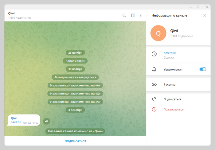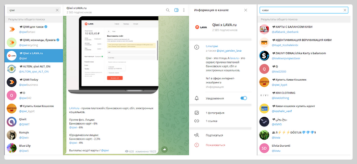 Юзернейм @qiwi был куплен за несколько миллионов рублей, про него писали крупные телеграм-каналы, но паблик всего лишь на 3-м месте в поиске по запросу “qiwi” и совсем отсутствует по запросу “киви”.