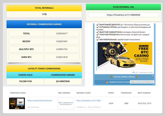 2. Реферальная программа биткоин-крана Freebitcoin. Гео — весь мир. Так как рефералы привязываются бессрочно, генерят доход в BTC, то пост в сетке висит всегда и трафик идет постоянно.