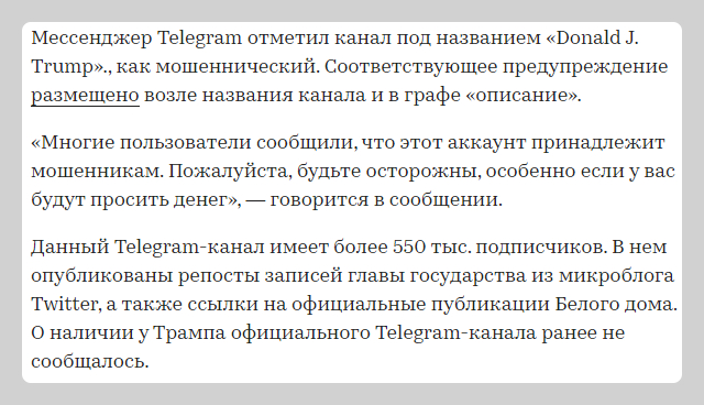 Еще один вариант это следить за трендами и занимать набирающие популярность юзернеймы раньше других. Через какое-то время есть неплохие шансы стать владельцем приличного размера сетки с хорошим УБТ. Отличный пример такого подхода когда после блокировки аккаунта в Твиттер какой-то ушлый админ создал фейковый телеграм-канал под запрос «Donald J. Trump», с юзернеймом @Trump и на него без какой-либо рекламы подписалось несколько сотен тысяч человек.