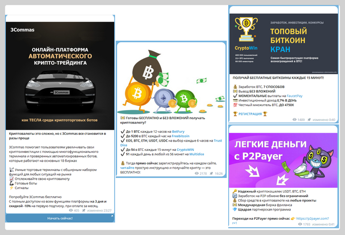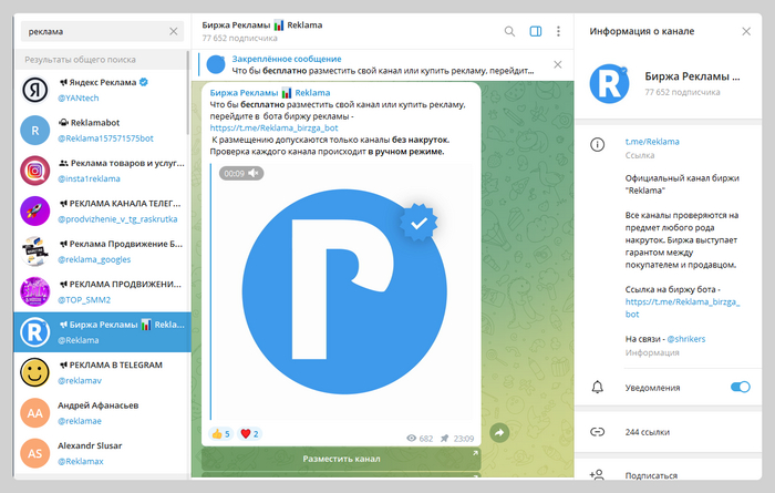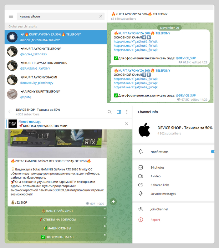 В поиске можно встретить каналы с объявлениями о продаже компьютерной техники, смартфонов и гаджетов. Стандартная схема — с сетки каналов-доров переливать трафик на основной канал, где и закрываются продажи.
