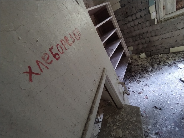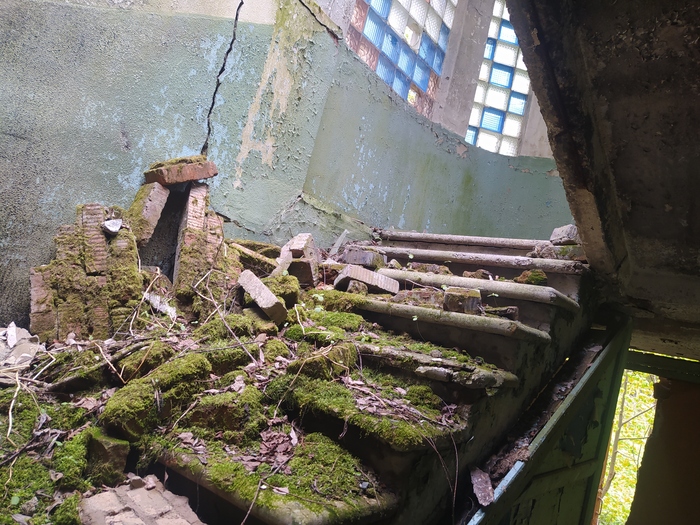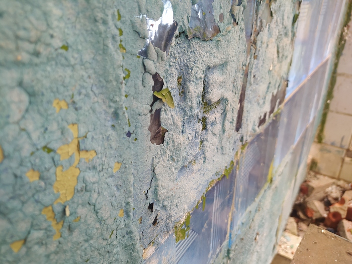 Но самое яркое впечатление произвёл основной корпус с актовым залом, столовой и живой мозаикой на фасадах. Здание трёхэтажное с нормальным выходом на крышу, широкие пространства и фрески весьма не дурного исполнения. Мусор видно выносят, шаткие конструкции сносят, но остатки искусства не трогают.
