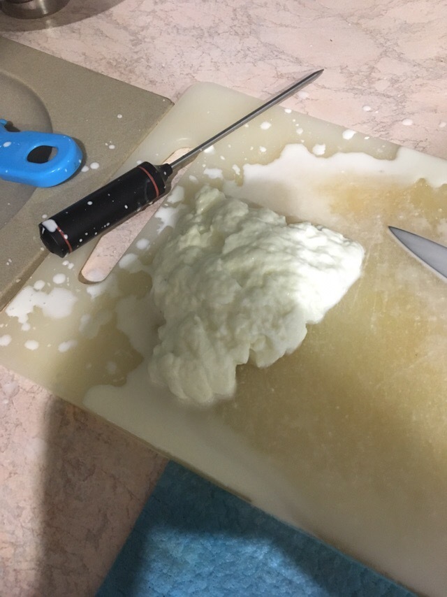 Сгусток начал образовываться почти мгновенно. Подождал 20 минут. Попытался нарезать кубиками, но это не особо вышло. Также, по сравнению с другими гайдами - сгусток был на дне, а не всплыл, как у большинства, не знаю почему так, температура все время была в норме. Кое-как нарезав это дело поварил еще 20 минут, плавно вымешивая.