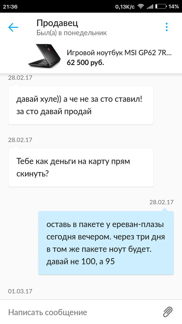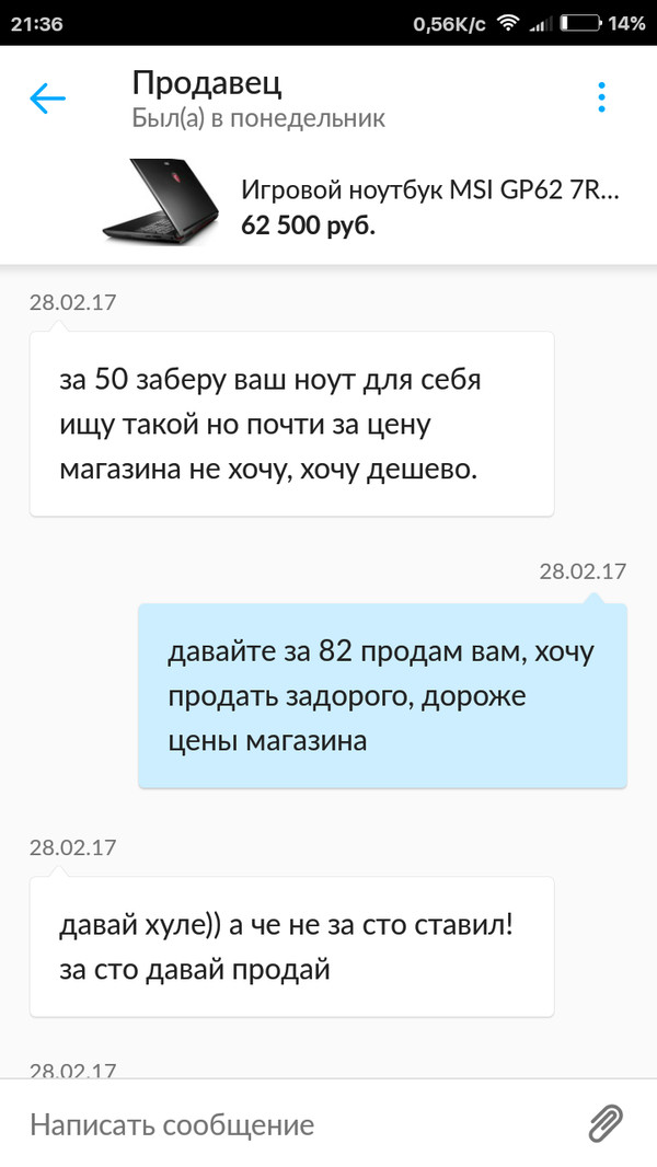 42 dOzmey 8 лет назад Бойкий торг Продавал ноут на Авито. Образец адекватного торга) Дальше 18+) Показать полностью 2 [моё] Авито Торговля 80 lvl Длиннопост