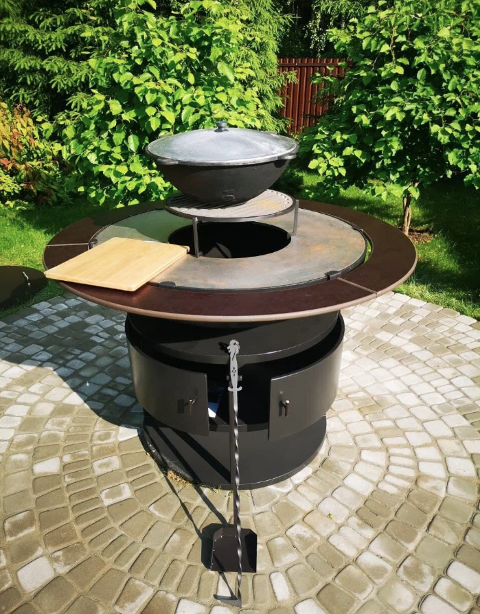 А ещё мы сделали линейку гриль-столов Pro — это уже не просто мангал, а целая кухня под открытым небом. Там есть раковина, подсветка, ящики для инструментов и даже столешницы из калёного стекла и столетнего дуба.