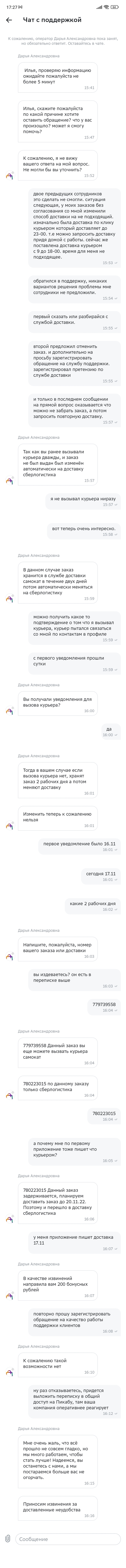 Первый специалист - сообщила что на курьеров самоката сейчас большая нагрузка(видимо они осуществляют эту доставку за 15-30 минут) и заказ передан в сберлогистику, и со всеми вопросами идите туда. На вопрос как можно оставить претензию на работу службы поддержки в связи с моим долгим ответом закрыла чат. ну ок пробуем второй раз .
