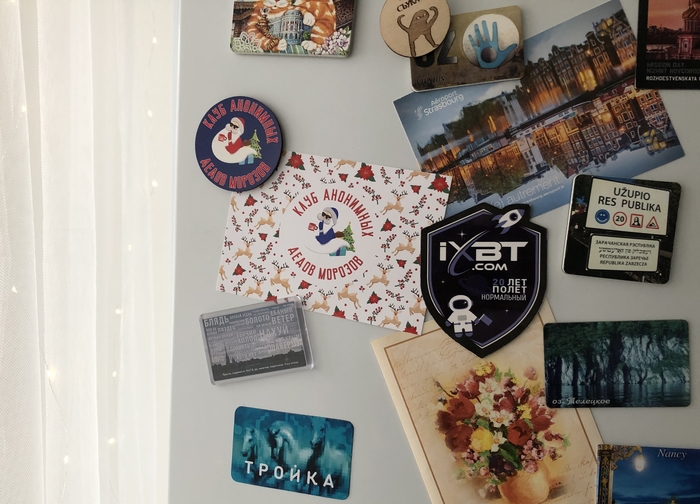 Открытка (прямо подписанная! Прямо мне! Прямо руками! Восторг). И магнитик! Оба теперь живут на холодильнике в тамошней композиции.