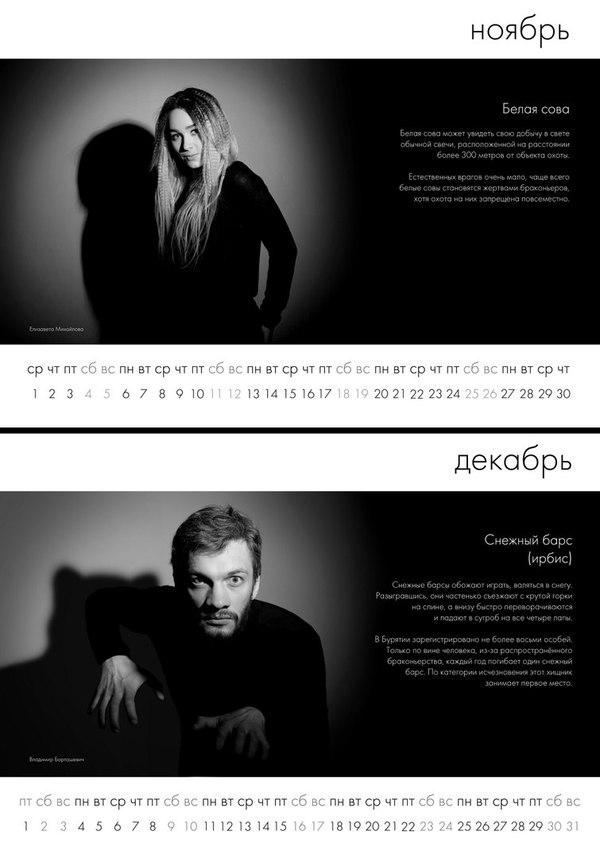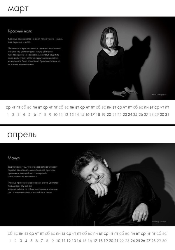 Эти фотоработы – наше представление о том, каким может быть будущее, в котором новое поколение сможет увидеть исчезнувших животных только в исполнении актёров. И тогда будет трудно оценить уровень актерского мастерства, так как сравнить с оригиналом станет невозможно. Но есть и другое будущее, где подобные проекты – лишь творческая необходимость без какого-либо экологического подтекста, где все мы будем ответственнее и уважительнее относиться к природе и сохраним ее для потомков."