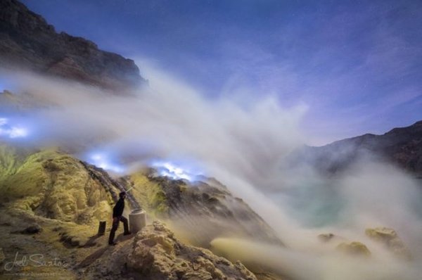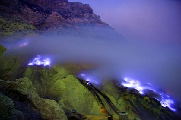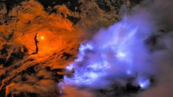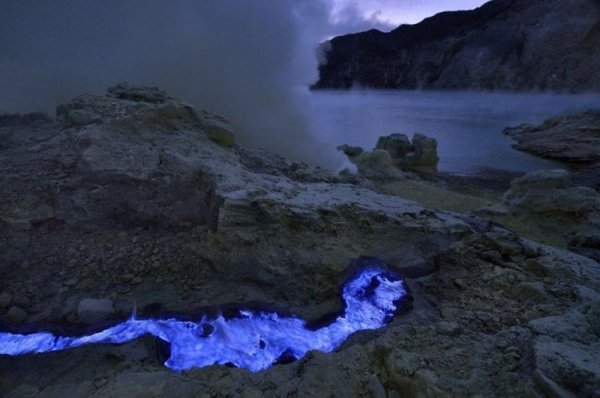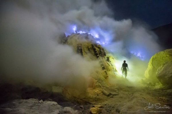 Внутри вулканического комплекса Иджен в Индонезии расположено самое большое кислотное озеро в мире — Кавах Иджен. Из-за постоянно возгорающейся серы вулкан приобретает совершенно фантастический вид. Однако из-за ядовитых испарений находиться здесь без противогаза опасно для здоровья.