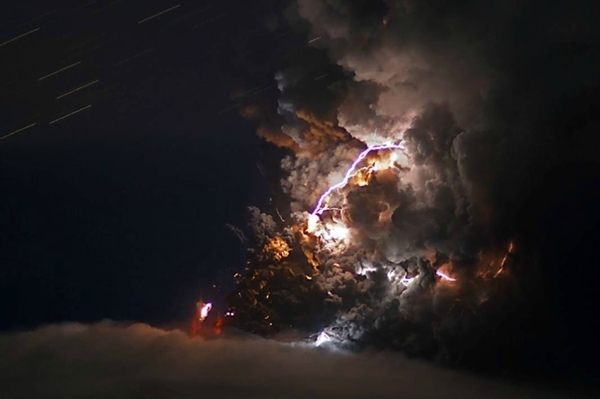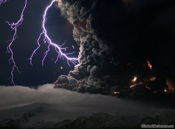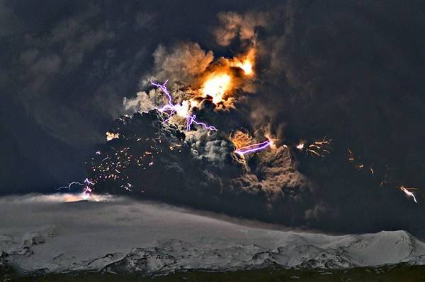 Это не фотошоп, это действительно интересный факт. Причина возникновения обычной молнии при грозе остается предметом исследований, а природа вулканической молнии еще менее понятна. Одна из гипотез предполагает, что выбрасываемые пузыри магмы или вулканический пепел несут электрический заряд и при их движении возникают такие разделенные области. Однако вулканические молнии могут быть вызваны и наводящими заряд столкновениями в вулканической пыли. природа